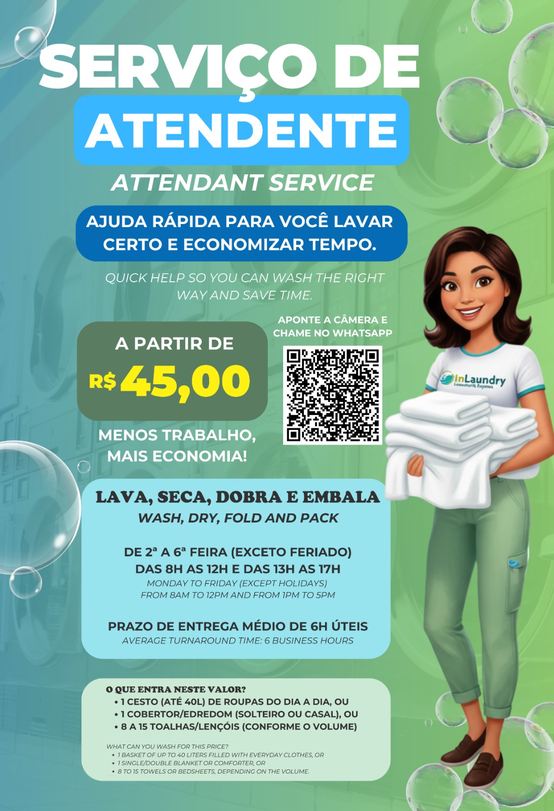 💳 O pagamento é feito separadamente: primeiro você paga a lavagem (R$ 17,90), realiza o processo, e depois, se quiser secar, faz um novo pagamento para a secagem (R$ 17,90). Aceitamos dinheiro, cartão e PIX, e para sua maior comodidade, temos o serviço de atendente! 💰